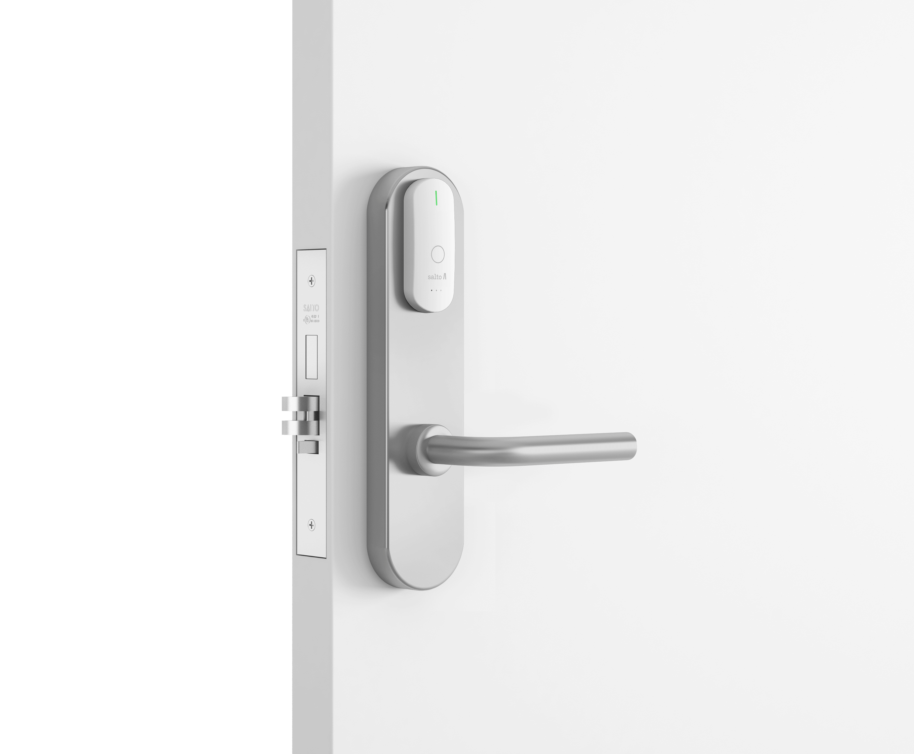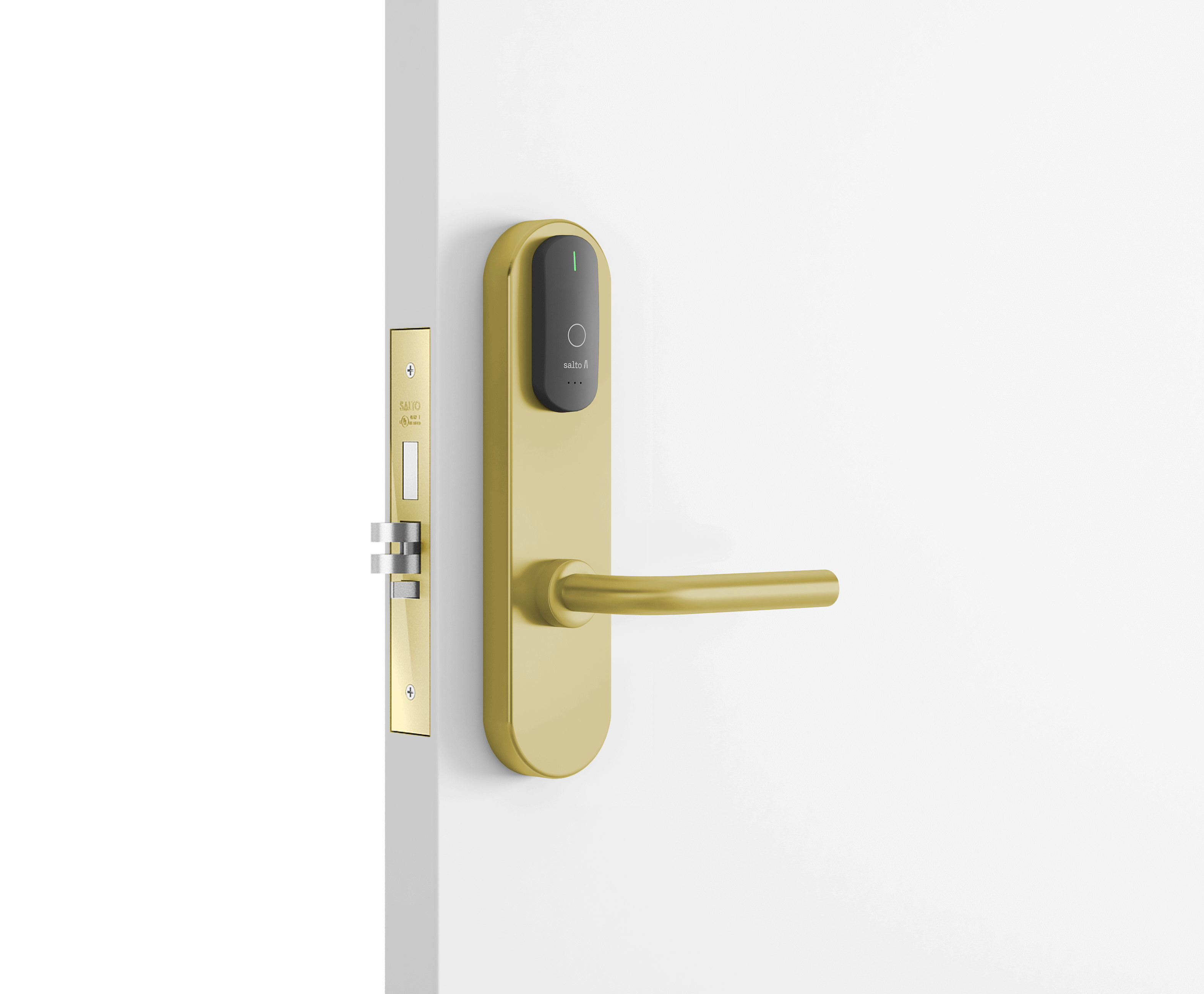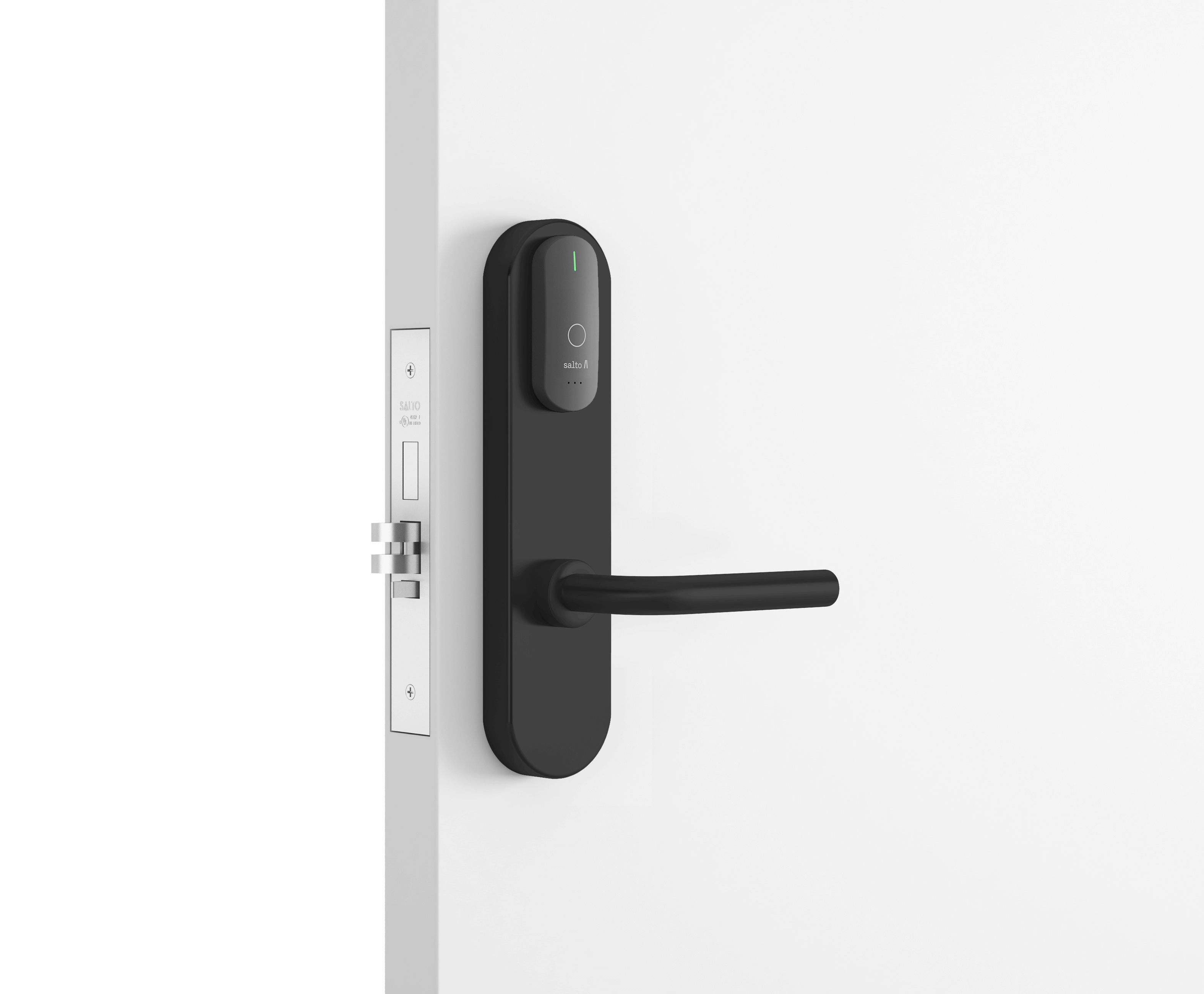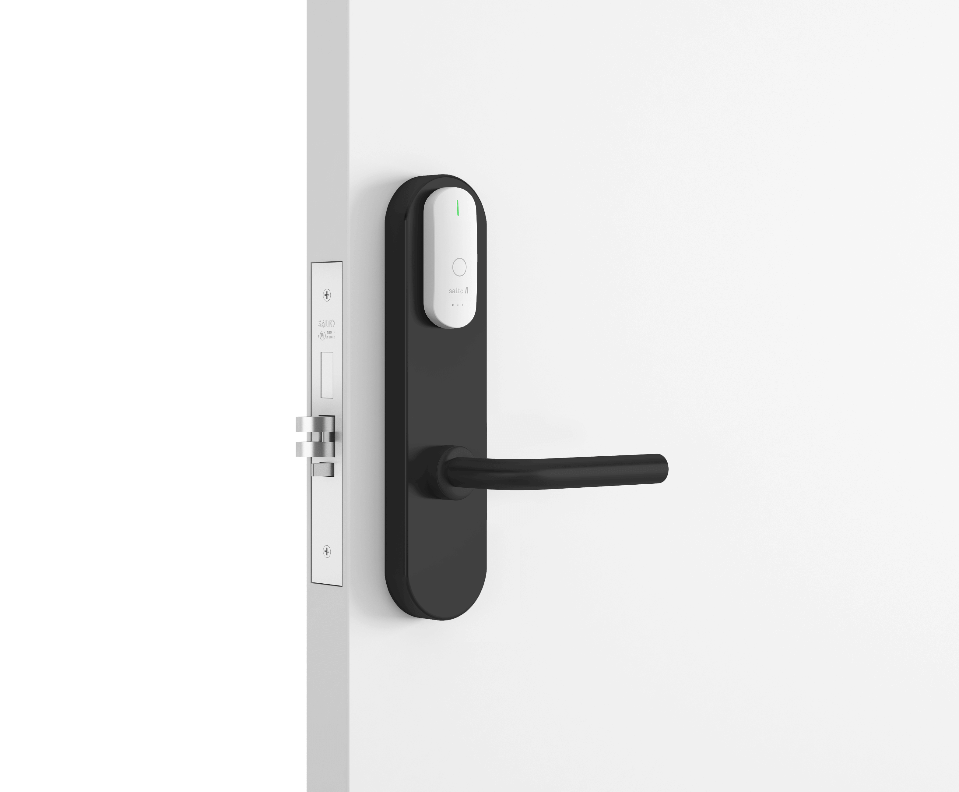 - Замок всегда можно открыть изнутри (благодаря функции «Анти-паника», которая работает вместе с врезным замком серии SALTO LA1T15).