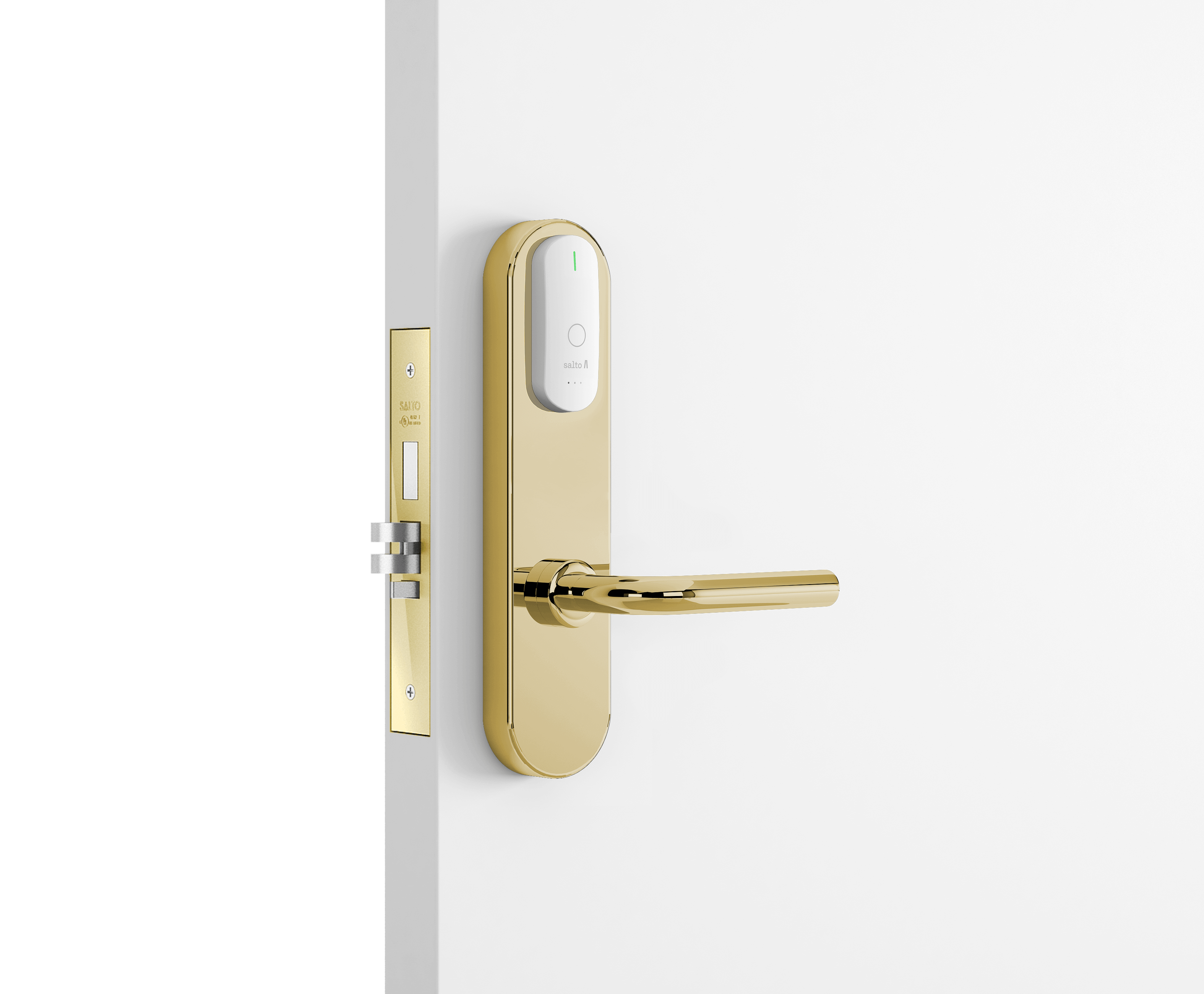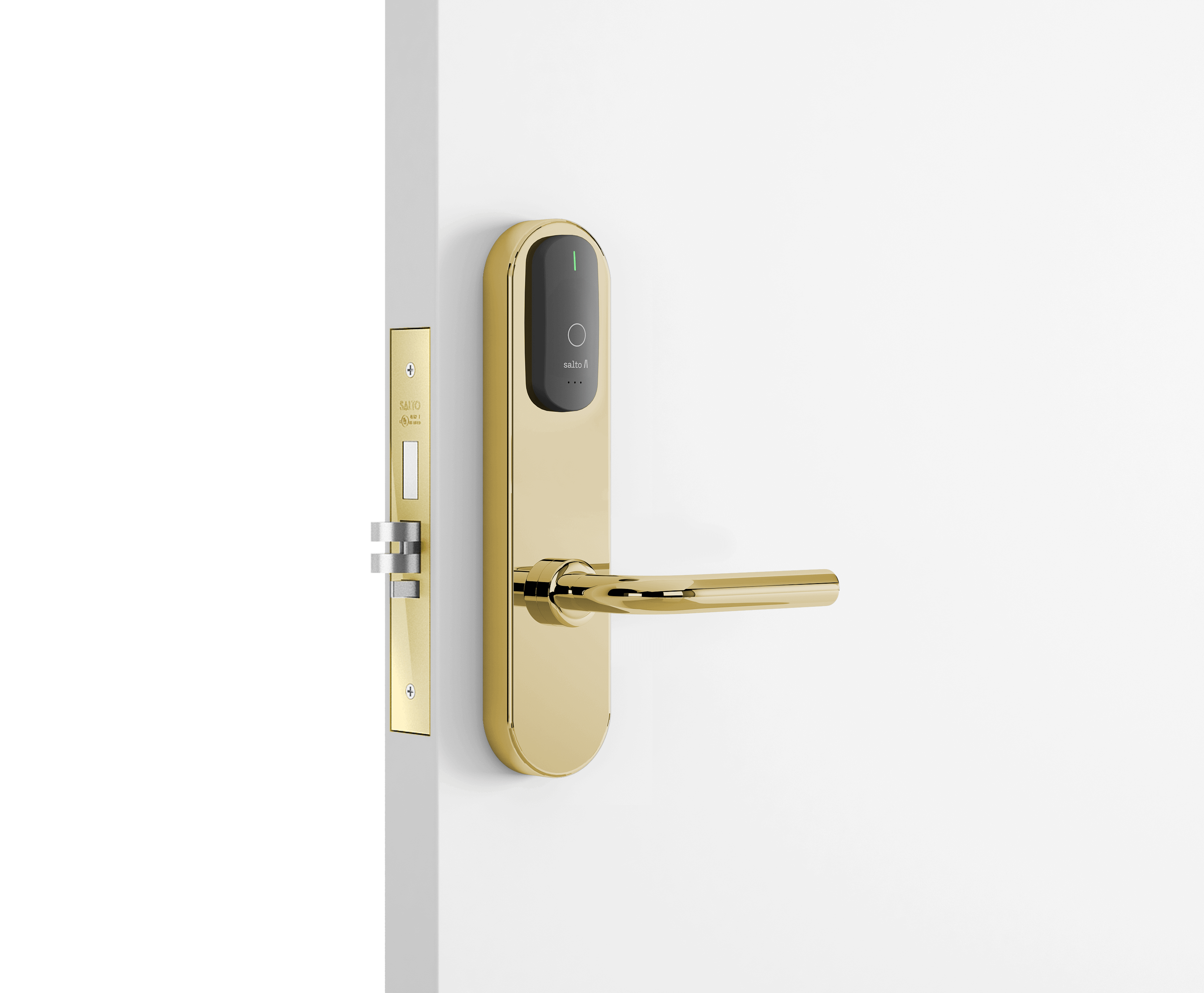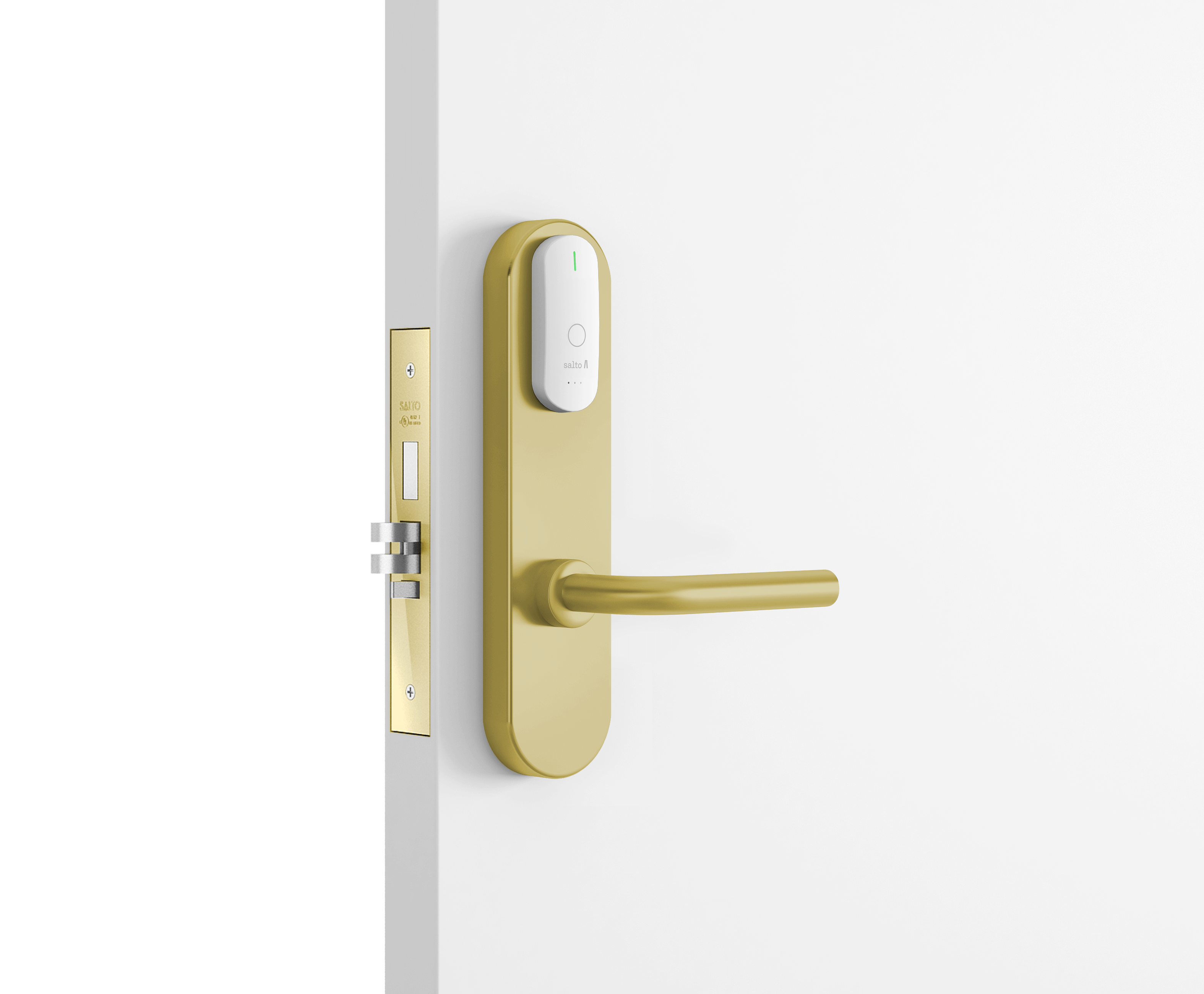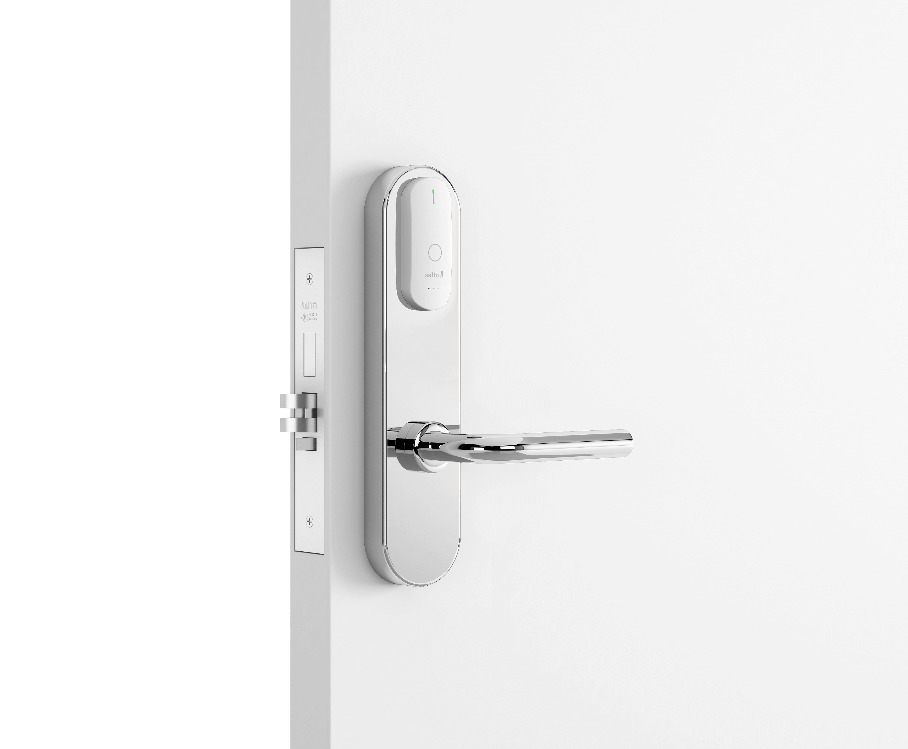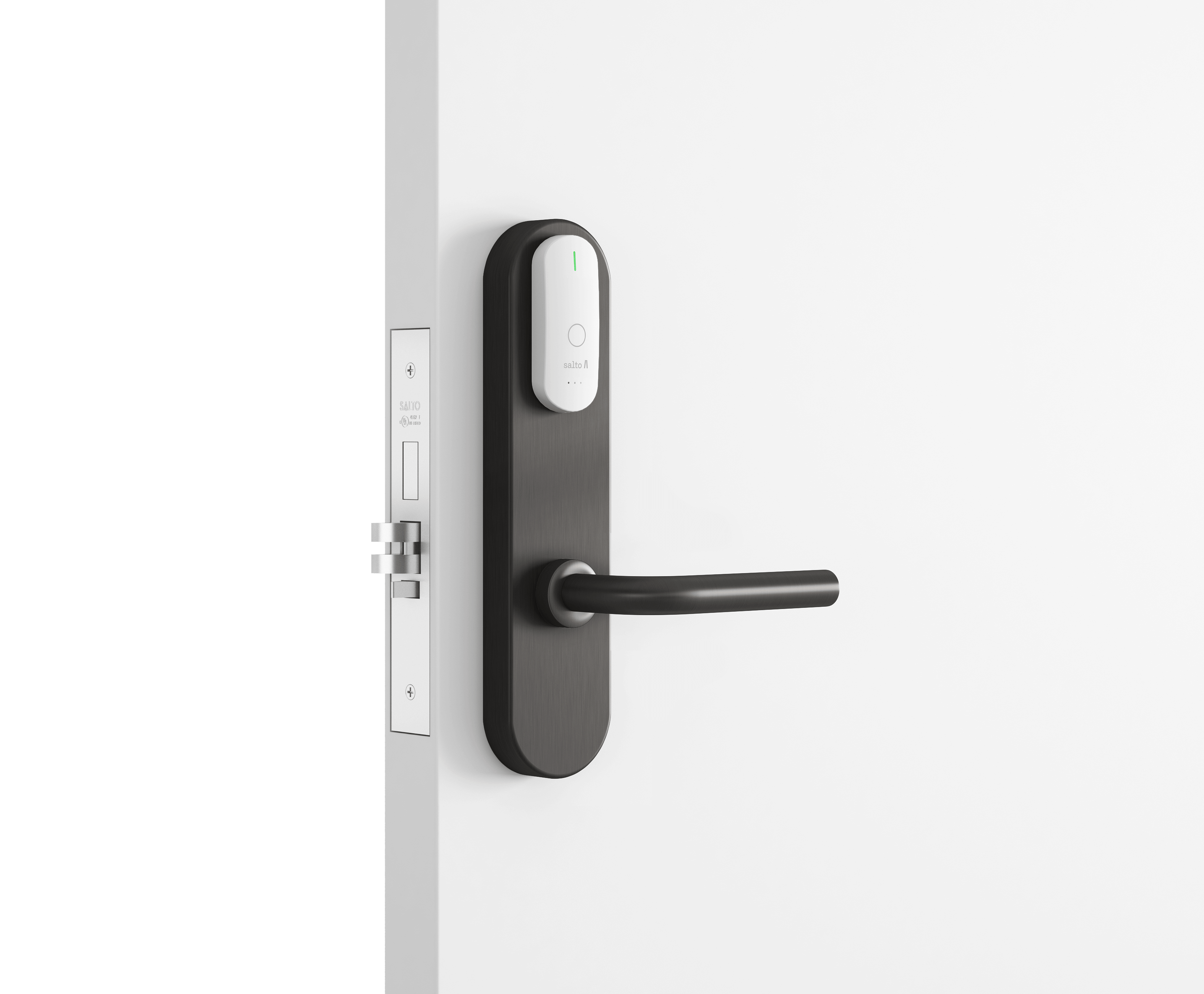 - Замок всегда можно открыть изнутри (благодаря функции «Анти-паника», которая работает вместе с врезным замком серии SALTO LA1T15).